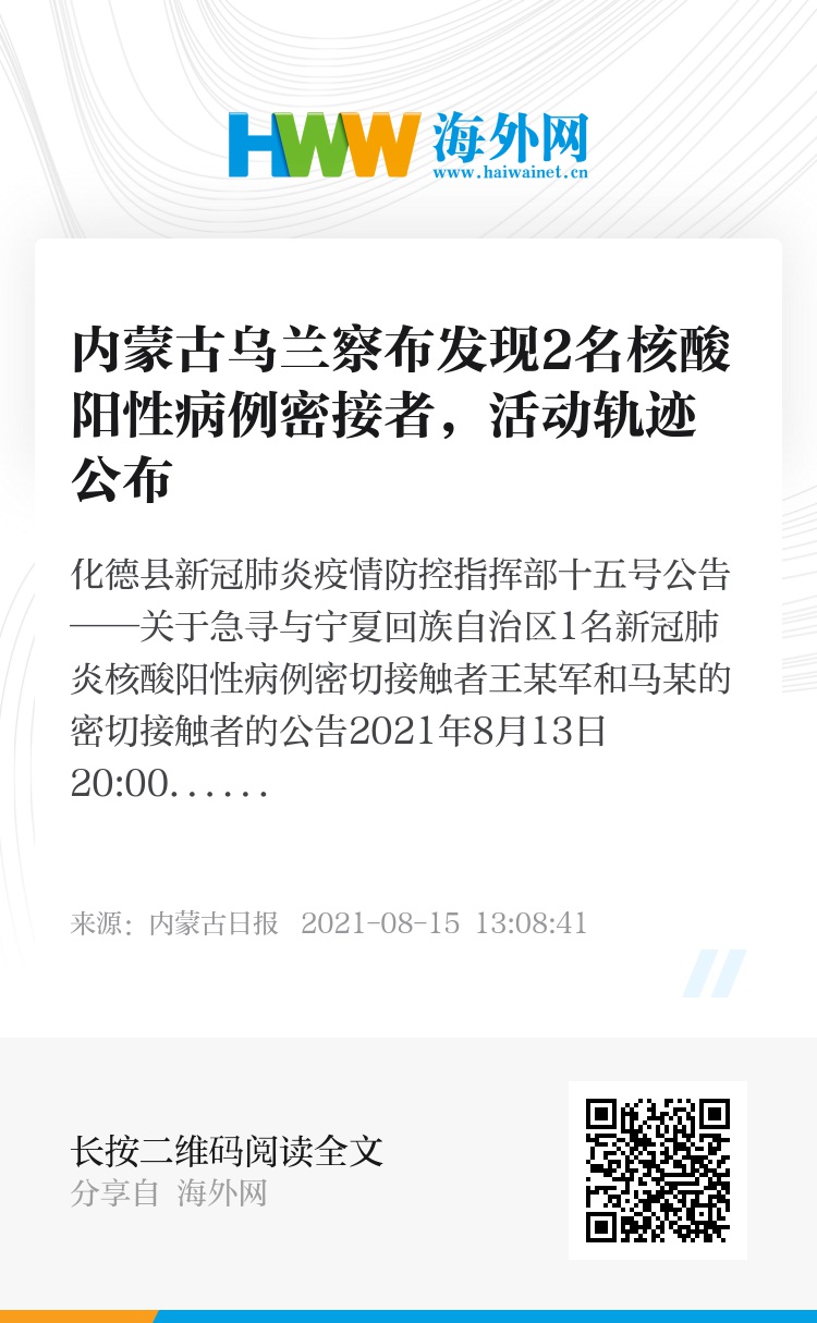 2021年8月13日20:00时,内蒙古乌兰察布化德县疫情防控指挥部社会管控组接到乌兰察布市疫情防控指挥部信息推送,有2名与新冠肺炎核酸阳性病例密切接触者居住化德县。根据流调情况,现将王某军和马某的相关信息及行程轨迹公布如下: