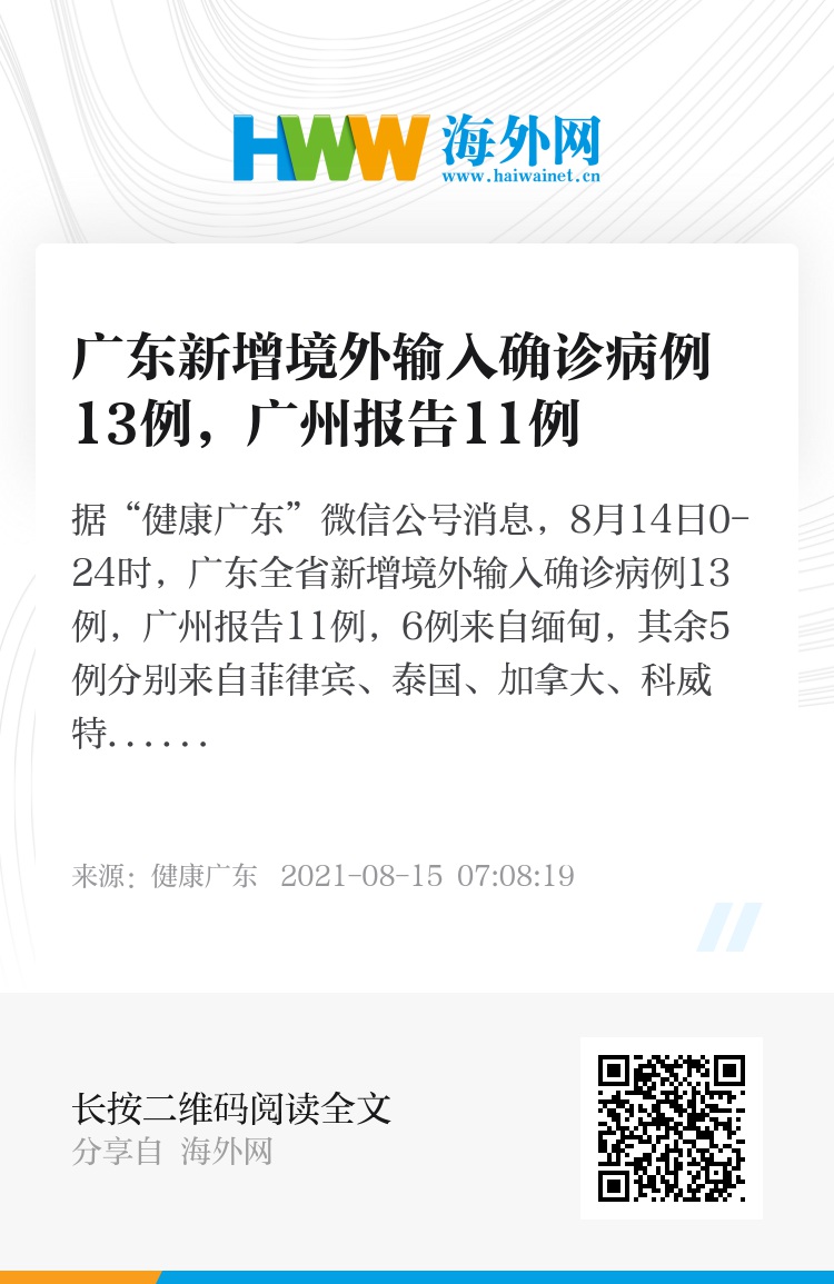 据“健康广东”微信公号消息,8月14日0-24时,广东全省新增境外输入确诊病例13例,广州报告11例,6例来自缅甸,其余5例分别来自菲律宾、泰国、加拿大、科威特和刚果(金);佛山报告1例,来自沙特阿拉伯;肇庆报告1例,来自坦桑尼亚。新增境外输入无症状感染者14例,广州报告10例,3例来自科威特,2例来自菲律宾,2例来自孟加拉国,其余3例分别来自缅甸、卡塔尔和沙特阿拉伯;深圳报告1例,来自肯尼亚;佛山报告1例,来自沙特阿拉伯;肇庆报告2例,分别来自利比里亚和刚果(金)。新增出院10例。