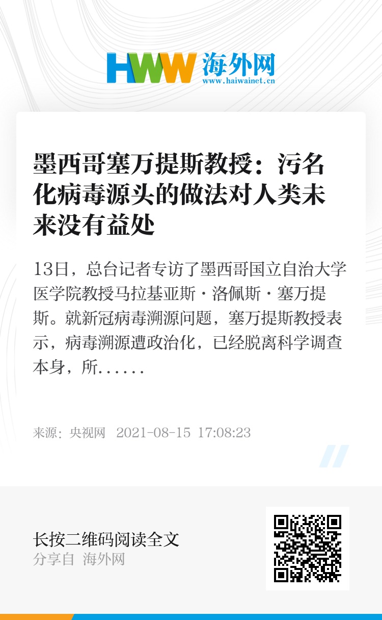 墨西哥国立自治大学医学院教授 马拉基亚斯·洛佩斯·塞万提斯:我认为病毒溯源被演变成政治性行为已经失去了科学调查本色,我认为这种对中国的指责毫无意义,“病毒由中国泄漏”这种论调非常荒唐。难道中国会故意先让病毒在自己国家传播就是为了之后把病毒再传播到别的国家?这完全没有任何逻辑,也没有道理。