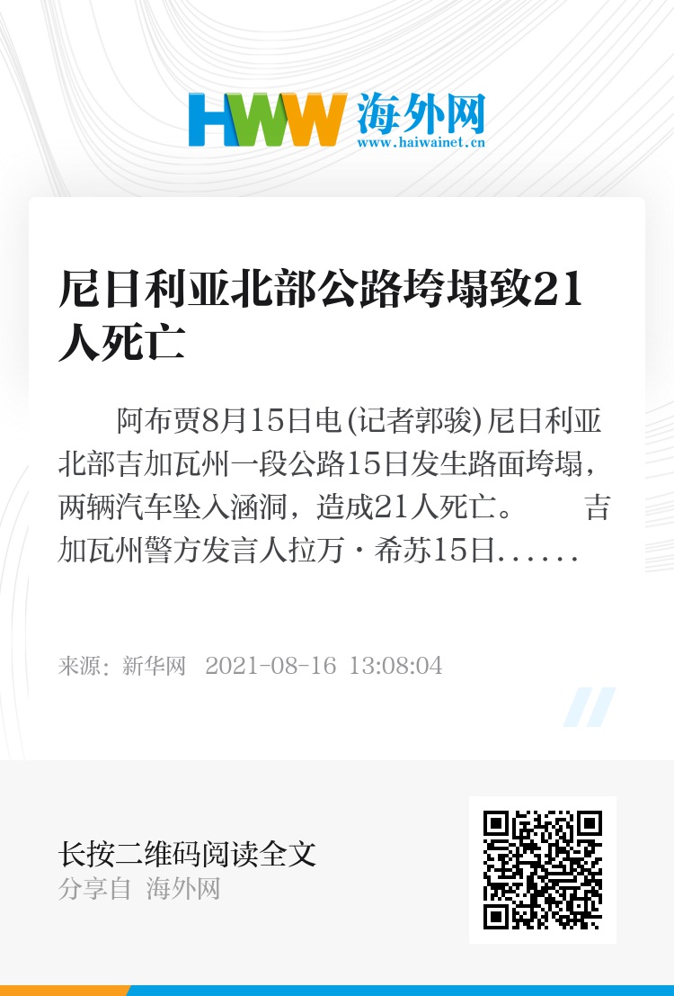新华社阿布贾8月15日电(记者郭骏)尼日利亚北部吉加瓦州一段公路15日发生路面垮塌,两辆汽车坠入涵洞,造成21人死亡。