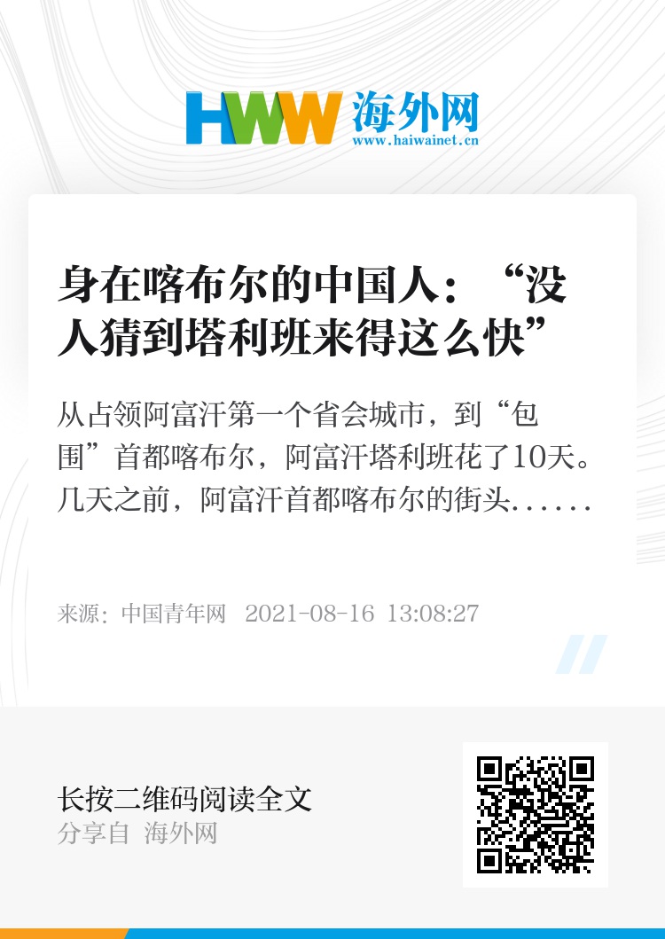 “以前街上有许多检查站,现在所有的检查站都已经撤销掉了,也看不到军警。”当地时间15日,在驻喀布尔某国际组织从事安全相关工作的中国人小冉(化名)接受澎湃新闻(www.thepaper.cn)采访时表示,“街上已经没有人了,普通人应该都在家里躲着。”