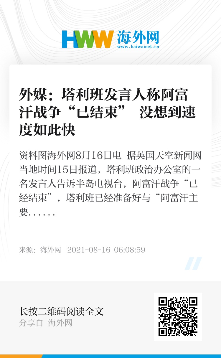 32195810,.外媒:塔利班发言人称阿富汗战争“已结束” 没想到速度如此快,.2021-08-16 06:21:59,.204009,.张霓、姚凯红