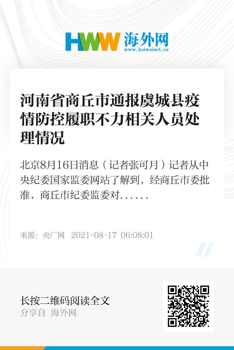 央广网北京8月16日消息(记者张可月)记者从中央纪委国家监委网站了解到,经商丘市委批准,商丘市纪委监委对虞城县疫情防控履职不力问题进行调查,根据调查情况对相关人员失职失责问题进行处理。通报如下: