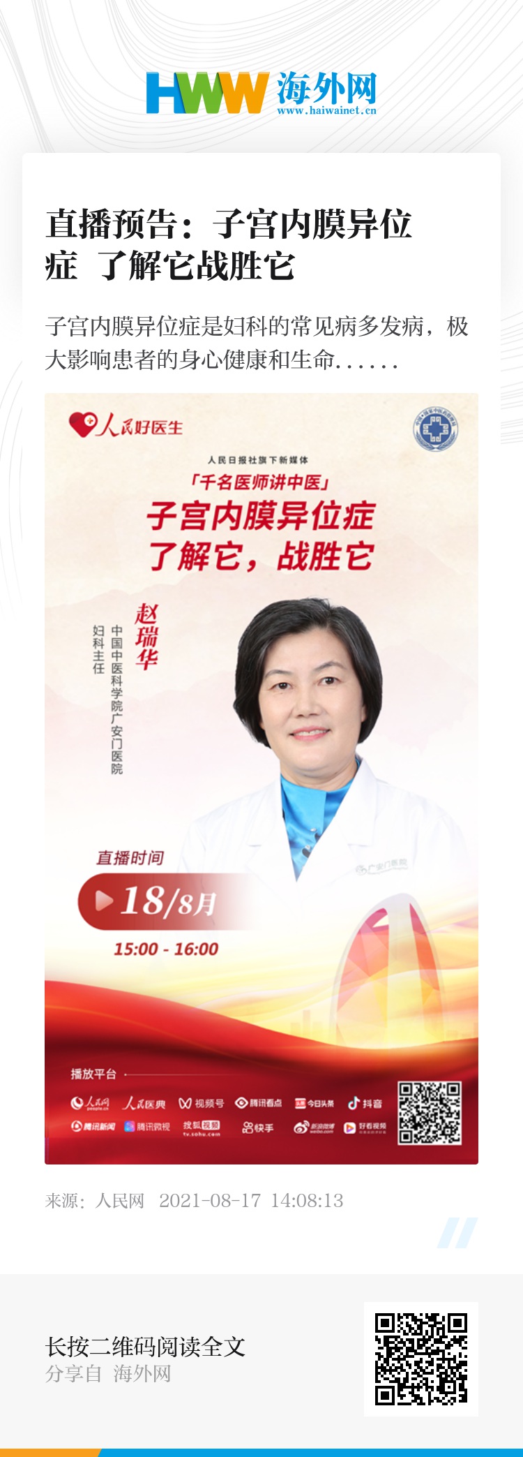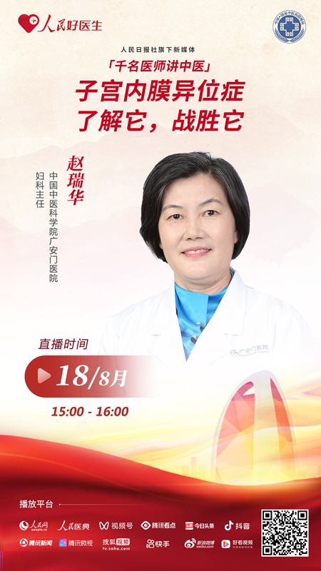 8月18日15:00,人民日报社旗下新媒体平台“人民好医生”与国家中医药管理局办公室联合推出的“千名医师讲中医”系列直播将邀请到中国中医科学院广安门医院妇科主任赵瑞华做客直播间,为大众详细科普子宫内膜异位症的防治,千万不要错过。