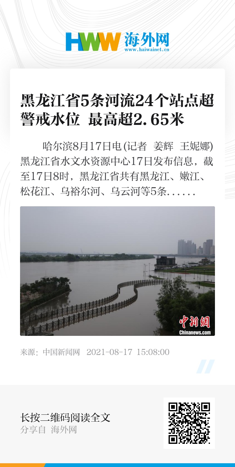 中新网哈尔滨8月17日电(记者 姜辉 王妮娜)黑龙江省水文水资源中心17日发布信息,截至17日8时,黑龙江省共有黑龙江、嫩江、松花江、乌裕尔河、乌云河等5条河流24个站点超过警戒水位0.03米至2.65米。