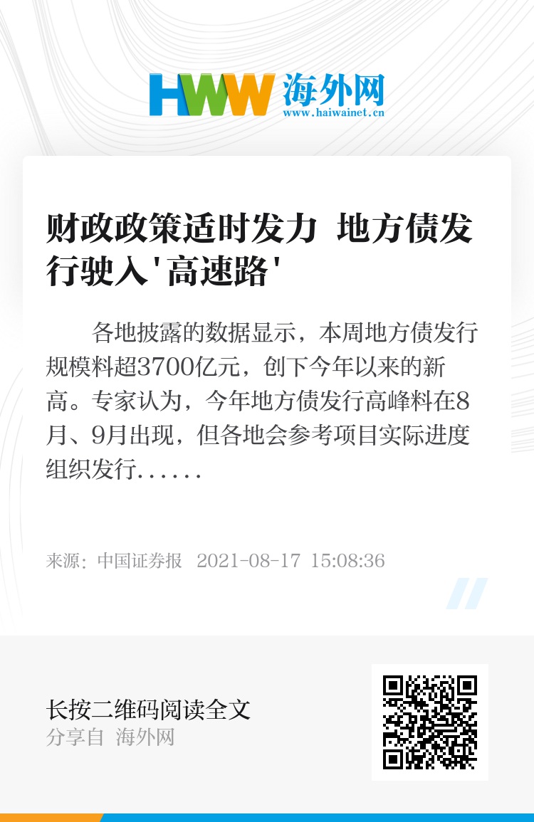 各地披露的数据显示,本周地方债发行规模料超3700亿元,创下今年以来的新高。专家认为,今年地方债发行高峰料在8月、9月出现,但各地会参考项目实际进度组织发行工作,“扎堆”发行概率有所降低。地方债发行放量将提振年内和明年一季度的基建投资增速。
