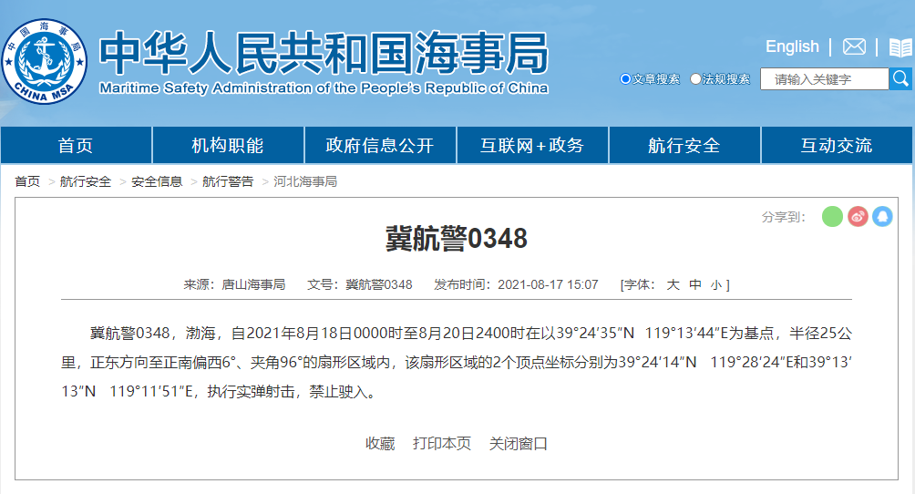 海外网8月17日电 据海事局网站消息,冀航警0348,渤海,自2021年8月18日0000时至8月20日2400时在以39°24′35″N 119°13′44″E为基点,半径25公里,正东方向至正南偏西6°、夹角96°的扇形区域内,该扇形区域的2个顶点坐标分别为39°24′14″N 119°28′24″E和39°13′13″N 119°11′51″E,执行实弹射击,禁止驶入。