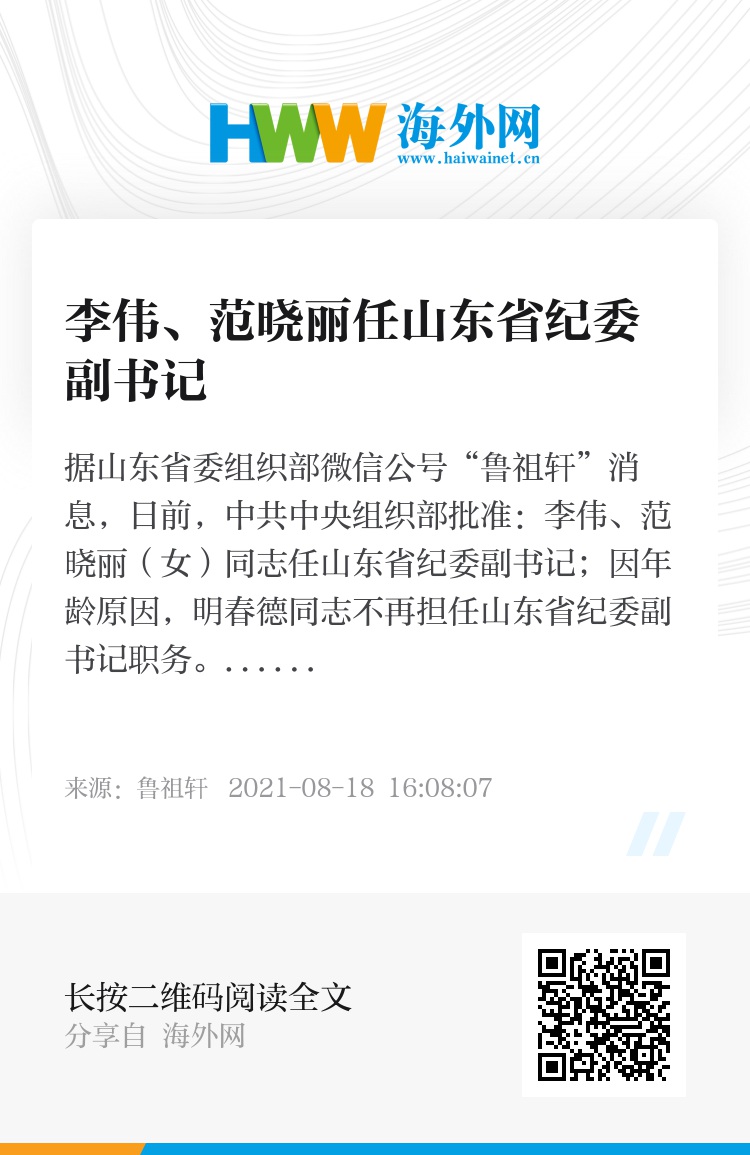 据山东省委组织部微信公号“鲁祖轩”消息,日前,中共中央组织部批准:李伟、范晓丽(女)同志任山东省纪委副书记;因年龄原因,明春德同志不再担任山东省纪委副书记职务。