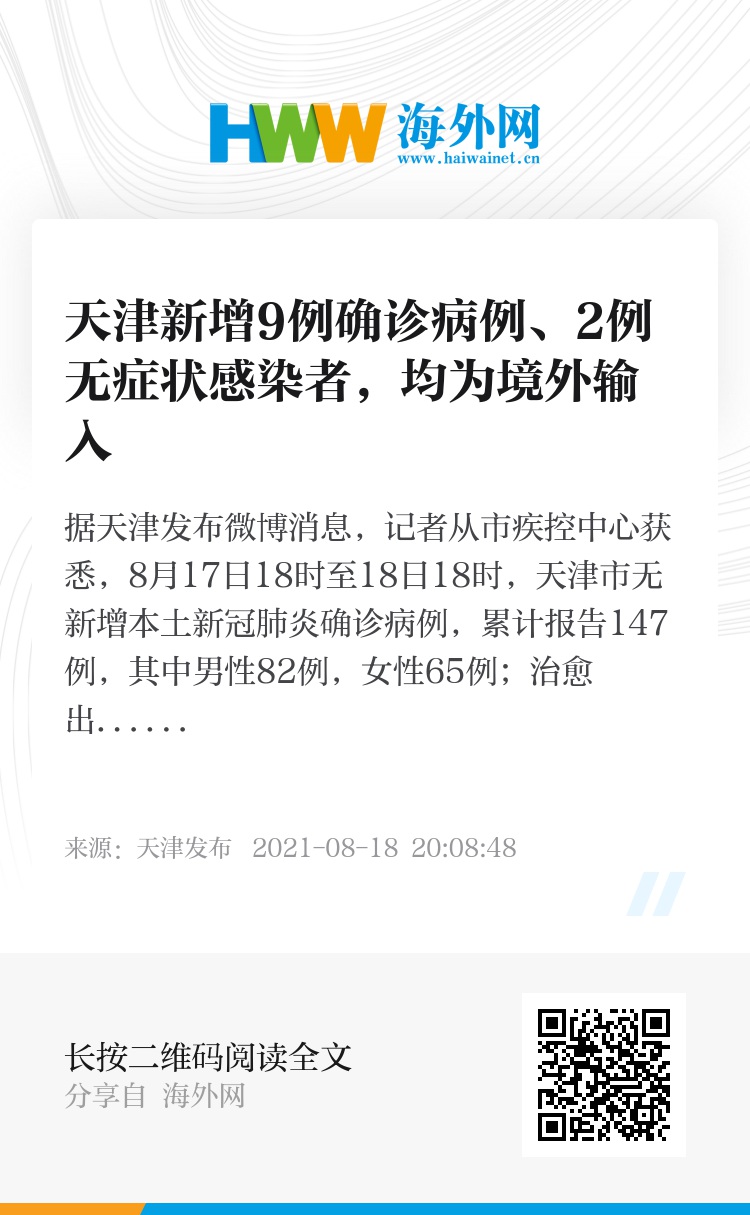 据天津发布微博消息,记者从市疾控中心获悉,8月17日18时至18日18时,天津市无新增本土新冠肺炎确诊病例,累计报告147例,其中男性82例,女性65例;治愈出院144例,病亡3例。