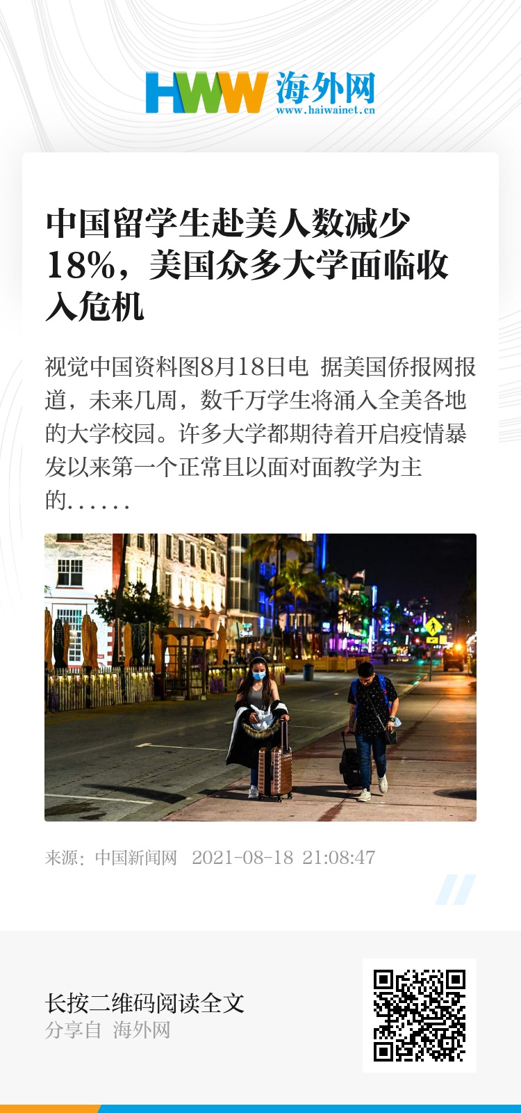 中新网8月18日电 据美国侨报网报道,未来几周,数千万学生将涌入全美各地的大学校园。许多大学都期待着开启疫情暴发以来第一个正常且以面对面教学为主的学年。不过,除了德尔塔(Delta)毒株持续蔓延之外,另一个因素也在威胁着全美大学能否恢复如常,即:美国大学可能正在失去对中国学生的吸引力,而中国正是美国最大的留学生来源地。