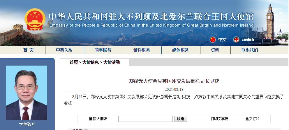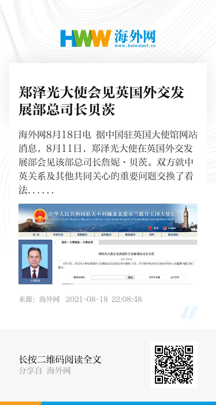海外网8月18日电 据中国驻英国大使馆网站消息,8月11日,郑泽光大使在英国外交发展部会见该部总司长詹妮·贝茨。双方就中英关系及其他共同关心的重要问题交换了看法。