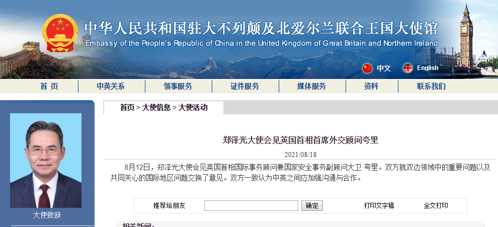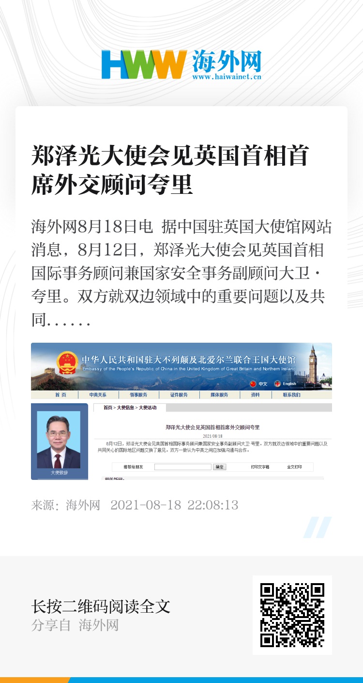 海外网8月18日电 据中国驻英国大使馆网站消息,8月12日,郑泽光大使会见英国首相国际事务顾问兼国家安全事务副顾问大卫·夸里。双方就双边领域中的重要问题以及共同关心的国际地区问题交换了意见。双方一致认为中英之间应加强沟通与合作。