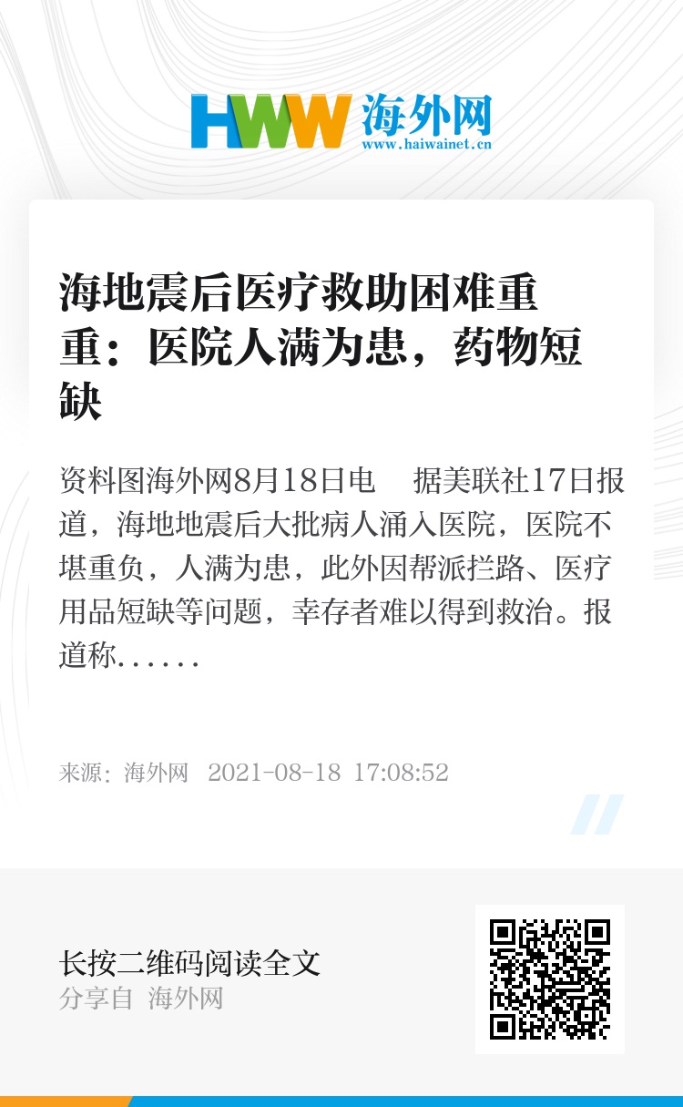 海外网8月18日电 据美联社17日报道,海地地震后大批病人涌入医院,医院不堪重负,人满为患,此外因帮派拦路、医疗用品短缺等问题,幸存者难以得到救治。