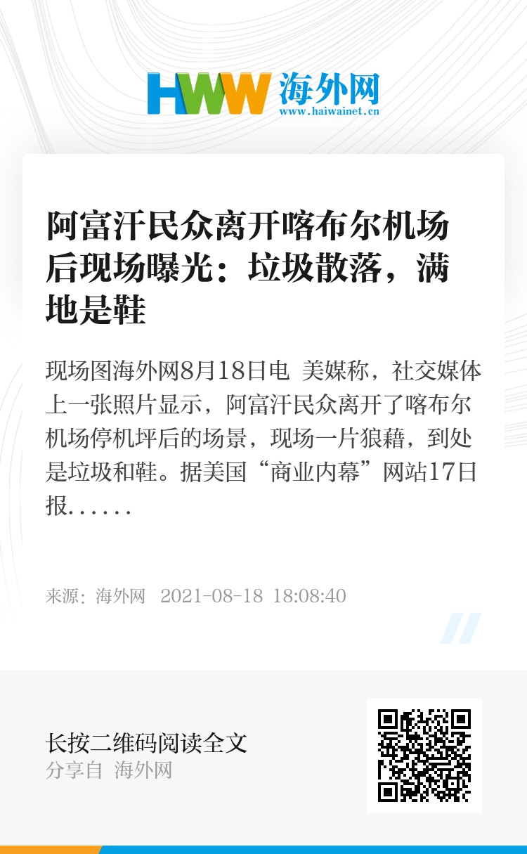 海外网8月18日电 美媒称,社交媒体上一张照片显示,阿富汗民众离开了喀布尔机场停机坪后的场景,现场一片狼藉,到处是垃圾和鞋。