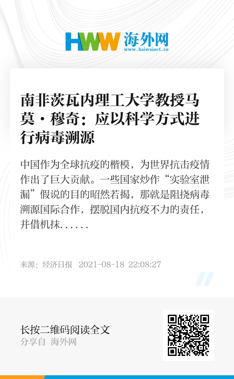 日前,南非茨瓦内理工大学教授兼英国牛津大学技术管理发展中心高级研究员马莫·穆奇在南非主流媒体《星报》发表评论文章称,中国在抗击新冠肺炎疫情中取得突出成就,但一些国家执意炒作新冠病毒“实验室泄漏”假说,企图抹黑和嫁祸中国,阻挠国际抗疫合作。文章强调,国际社会应该以科学的方式进行病毒溯源,加强团结合作,维护全球抗疫成果。