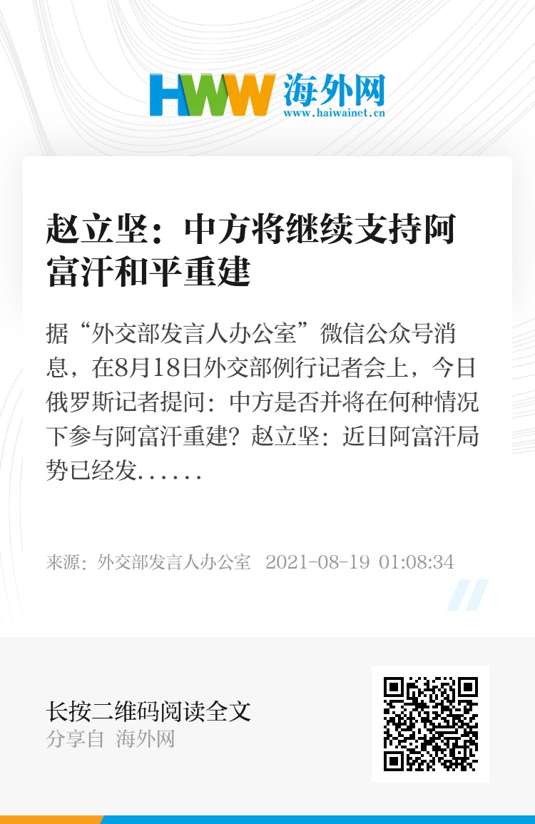 据“外交部发言人办公室”微信公众号消息,在8月18日外交部例行记者会上,今日俄罗斯记者提问:中方是否并将在何种情况下参与阿富汗重建?