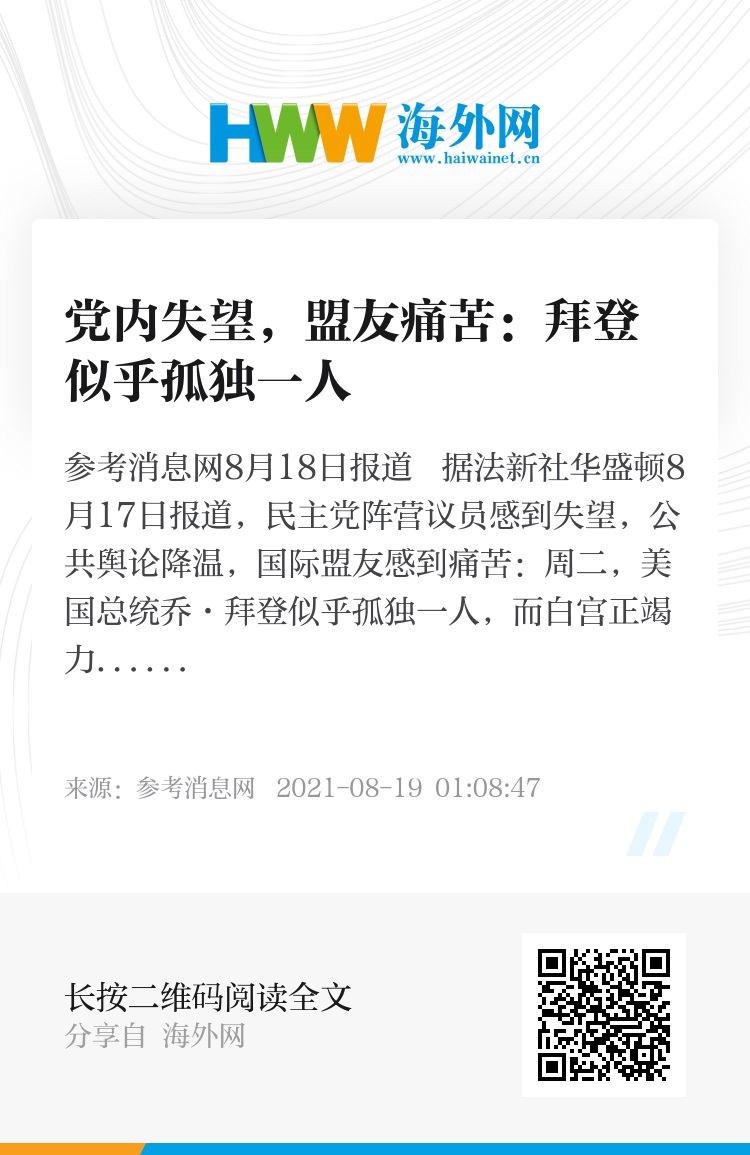 参考消息网8月18日报道 据法新社华盛顿8月17日报道,民主党阵营议员感到失望,公共舆论降温,国际盟友感到痛苦:周二,美国总统乔·拜登似乎孤独一人,而白宫正竭力为其从阿富汗撤军的决定进行辩护。