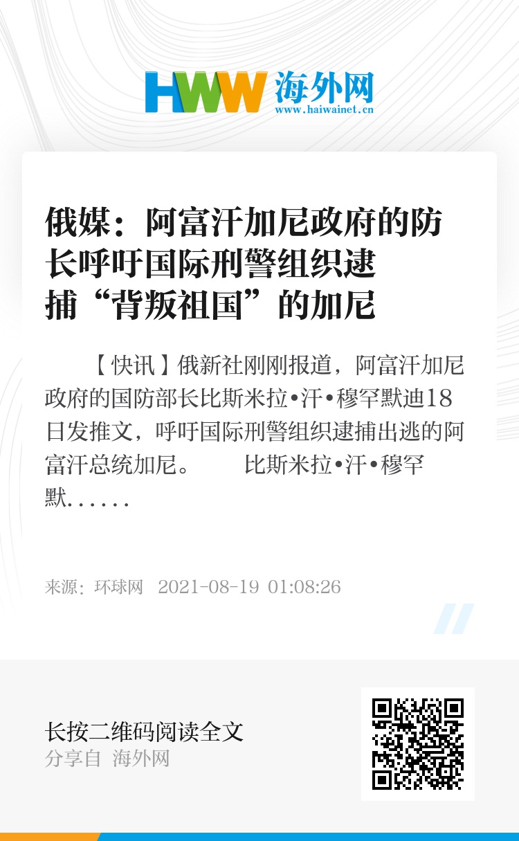 【环球网快讯】俄新社刚刚报道,阿富汗加尼政府的国防部长比斯米拉•汗•穆罕默迪18日发推文,呼吁国际刑警组织逮捕出逃的阿富汗总统加尼。
