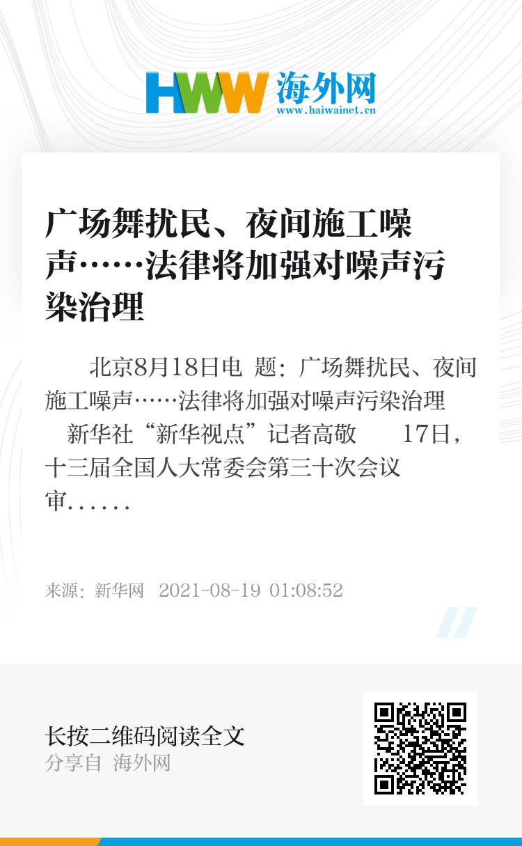 新华社北京8月18日电 题:广场舞扰民、夜间施工噪声……法律将加强对噪声污染治理