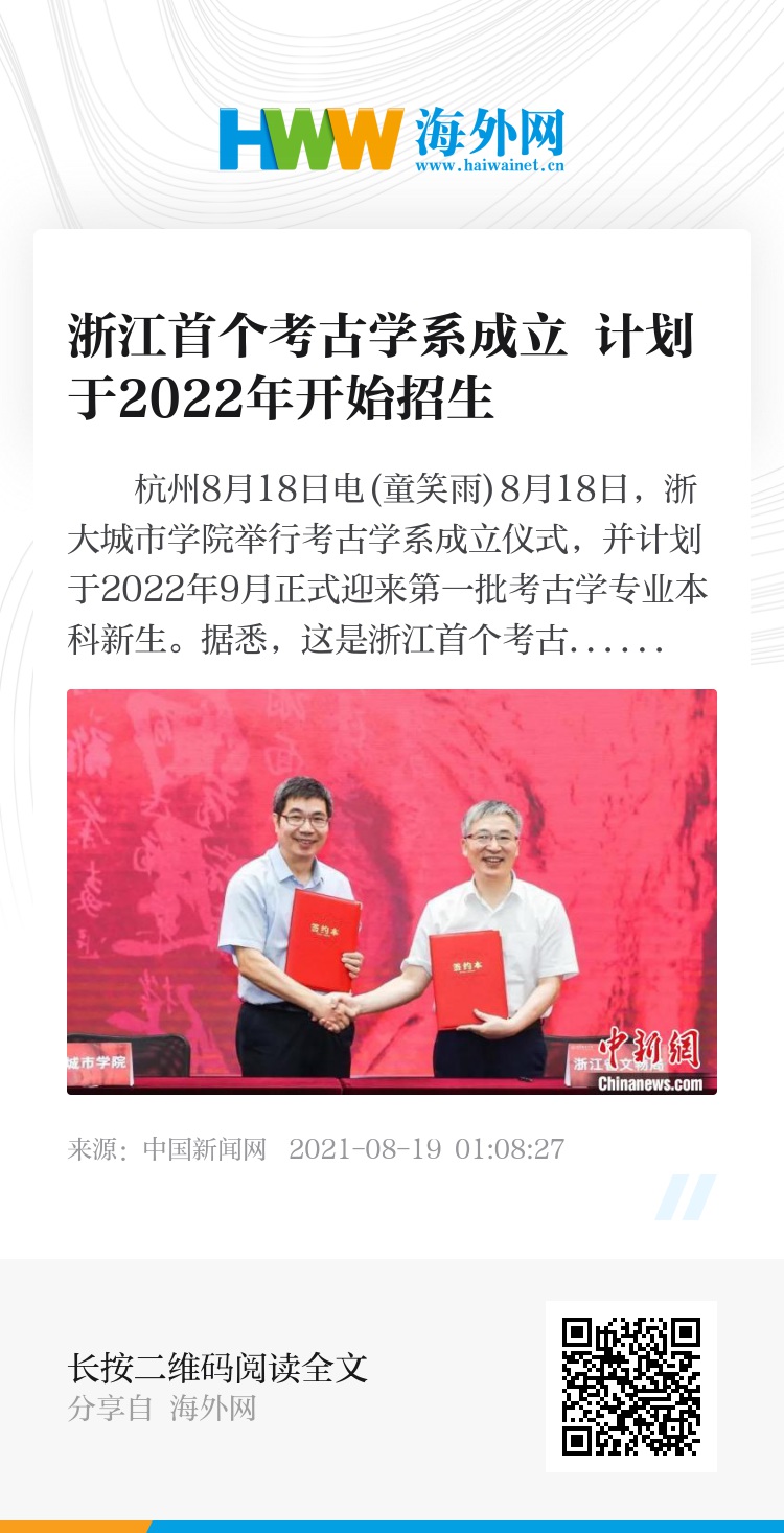 中新网杭州8月18日电(童笑雨)8月18日,浙大城市学院举行考古学系成立仪式,并计划于2022年9月正式迎来第一批考古学专业本科新生。据悉,这是浙江首个考古学系。