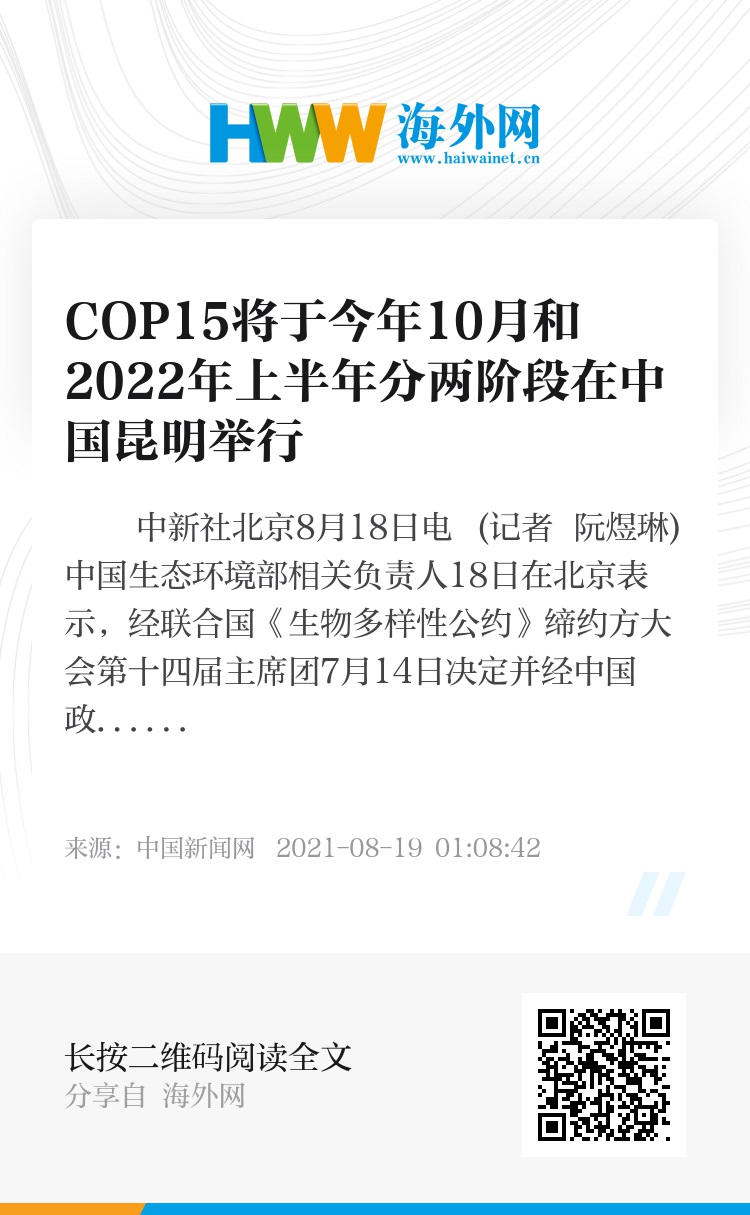 中新社北京8月18日电 (记者 阮煜琳)中国生态环境部相关负责人18日在北京表示,经联合国《生物多样性公约》缔约方大会第十四届主席团7月14日决定并经中国政府批准,《生物多样性公约》缔约方大会第十五次会议(简称“COP15”)将于2021年10月11日至15日和2022年上半年分两阶段在中国昆明举行。
