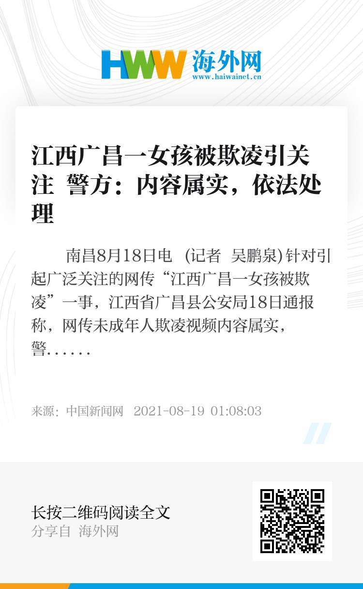 中新网南昌8月18日电 (记者 吴鹏泉)针对引起广泛关注的网传“江西广昌一女孩被欺凌”一事,江西省广昌县公安局18日通报称,网传未成年人欺凌视频内容属实,警方对六名违法行为人的寻衅滋事行为依法作出处理。