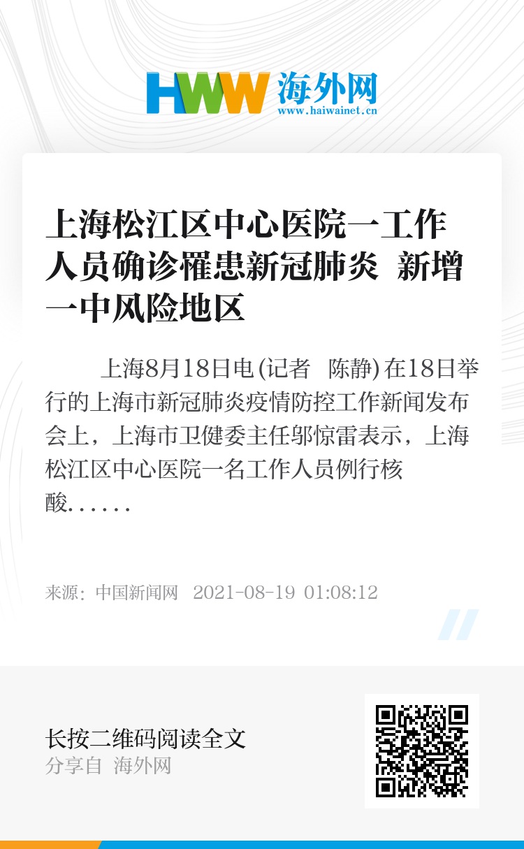 中新网上海8月18日电(记者 陈静)在18日举行的上海市新冠肺炎疫情防控工作新闻发布会上,上海市卫健委主任邬惊雷表示,上海松江区中心医院一名工作人员例行核酸检测结果为阳性,被诊断为新冠肺炎(轻型)病例。