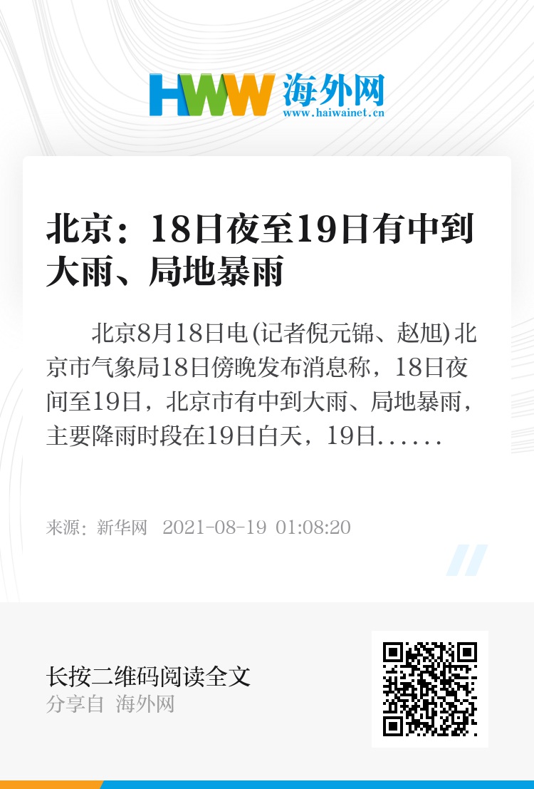 新华社北京8月18日电(记者倪元锦、赵旭)北京市气象局18日傍晚发布消息称,18日夜间至19日,北京市有中到大雨、局地暴雨,主要降雨时段在19日白天,19日夜间降雨逐渐减弱结束。气象部门提示,19日早晚高峰将受降雨影响,低洼路段容易积水,请勿涉水行车。