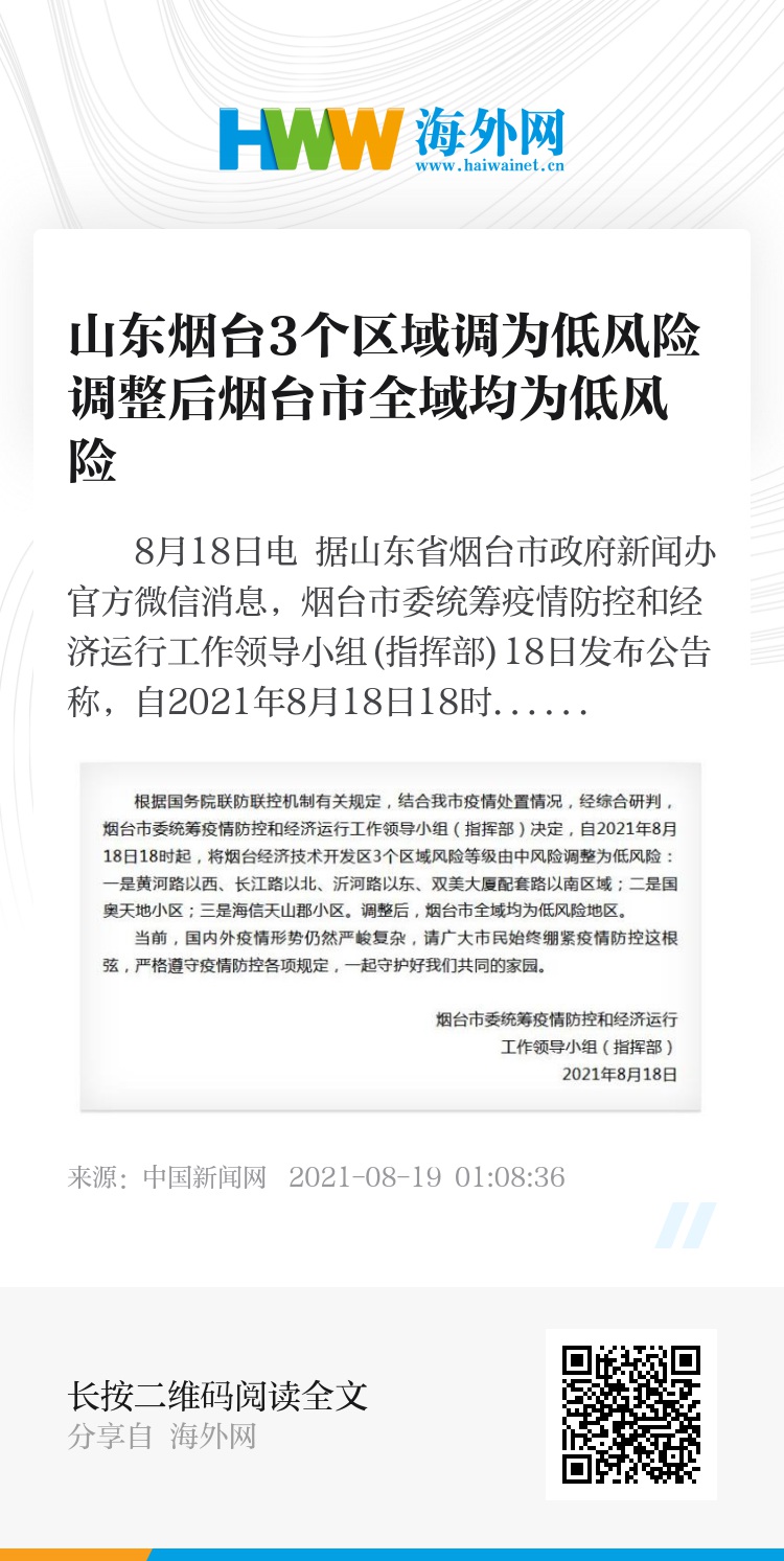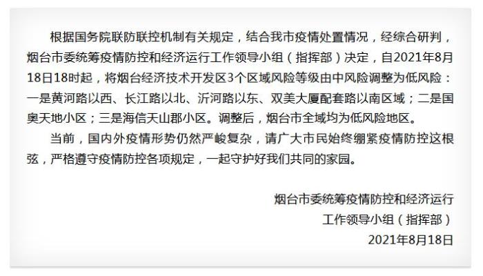 中新网8月18日电 据山东省烟台市政府新闻办官方微信消息,烟台市委统筹疫情防控和经济运行工作领导小组(指挥部)18日发布公告称,自2021年8月18日18时起,将烟台经济技术开发区3个区域风险等级由中风险调整为低风险:一是黄河路以西、长江路以北、沂河路以东、双美大厦配套路以南区域;二是国奥天地小区;三是海信天山郡小区。调整后,烟台市全域均为低风险地区。