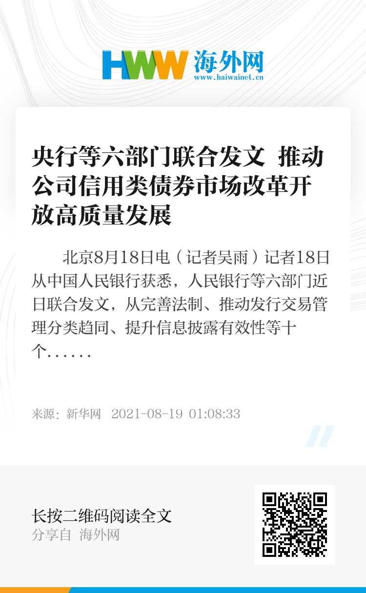 新华社北京8月18日电(记者吴雨)记者18日从中国人民银行获悉,人民银行等六部门近日联合发文,从完善法制、推动发行交易管理分类趋同、提升信息披露有效性等十个方面,对推动公司信用类债券市场改革开放和高质量发展提出了具体意见。