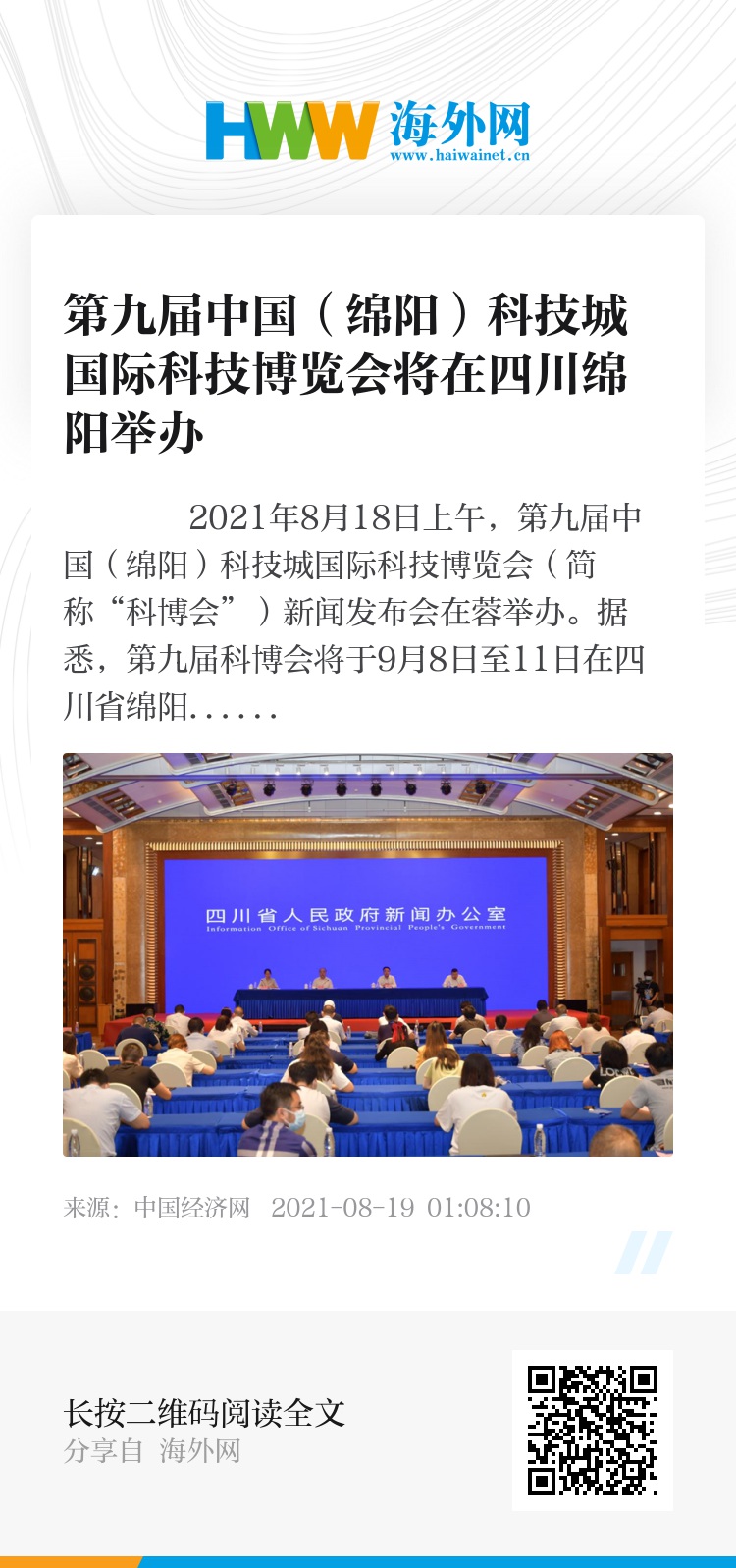 2021年8月18日上午,第九届中国(绵阳)科技城国际科技博览会(简称“科博会”)新闻发布会在蓉举办。据悉,第九届科博会将于9月8日至11日在四川省绵阳市举办。本届科博会主题为'创新引领・科技赋能・合作共享'。