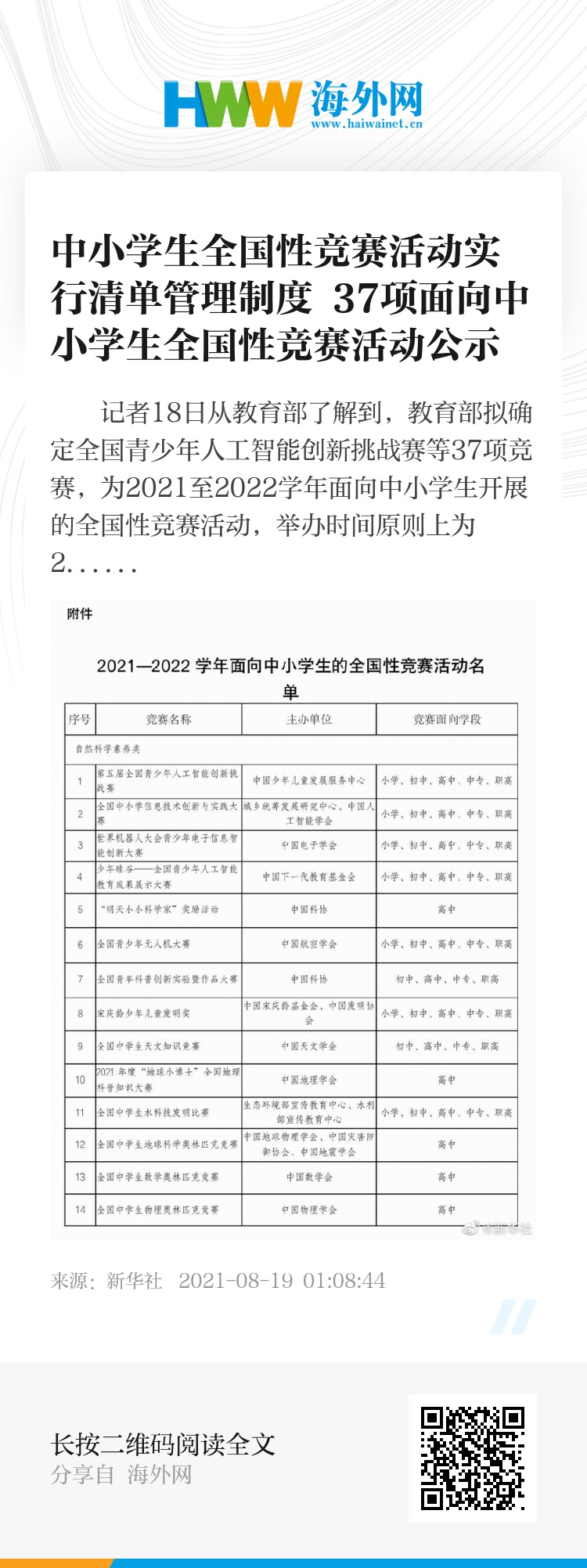 记者18日从教育部了解到,教育部拟确定全国青少年人工智能创新挑战赛等37项竞赛,为2021至2022学年面向中小学生开展的全国性竞赛活动,举办时间原则上为2022年8月前。现教育部办公厅正就相关信息进行公示。根据教育部相关规定,面向中小学生的全国性竞赛活动实行清单管理制度,清单每年动态调整一次。竞赛以及竞赛产生的结果不作为中小学招生入学的依据。(记者胡浩)
