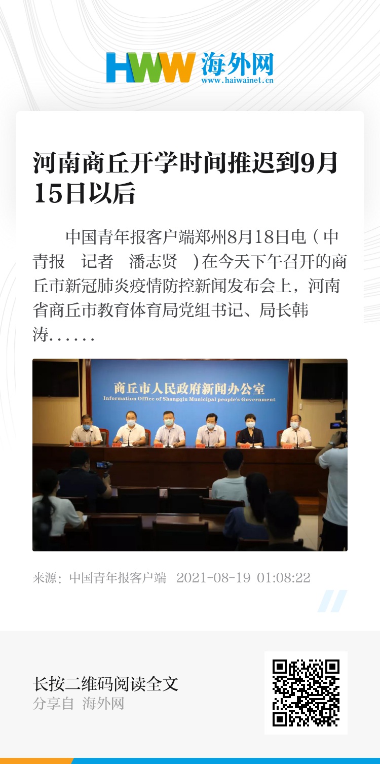 韩涛介绍,中小学及幼儿园具体返校时间,视疫情走势,经商丘市疫情防控指挥部和河南省教育厅批准后,提前一周向社会公布。高校、中职中专学生返校时间,以河南省教育厅疫情防控专班通知的时间为准。