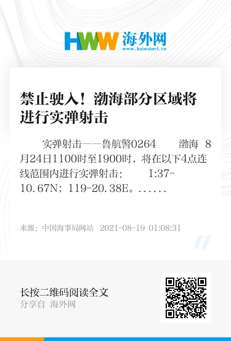 渤海 8月24日1100时至1900时,将在以下4点连线范围内进行实弹射击: