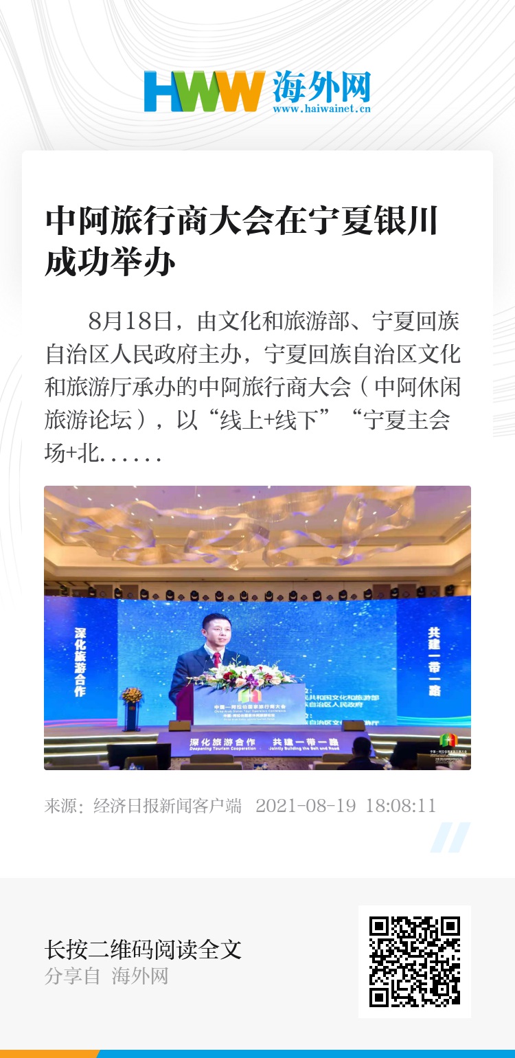 8月18日,由文化和旅游部、宁夏回族自治区人民政府主办,宁夏回族自治区文化和旅游厅承办的中阿旅行商大会(中阿休闲旅游论坛),以“线上+线下”“宁夏主会场+北京分会场”的形式,在宁夏、北京及线上同期成功举办。本次大会以“深化旅游合作,共建‘一带一路’”为主题,旨在为国际旅游业在后疫情时代强劲复苏搭建合作渠道,为推进国内旅游共享共赢创造良好平台,为宁夏旅游产业高质量发展提供强力引擎。
