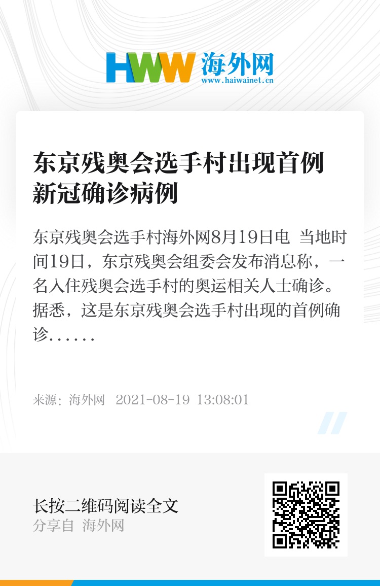 据日本《读卖新闻》19日报道,东京残奥会选手村于17日开村,本次出现的确诊患者为开村后的首例确诊病例。这名患者不是参赛选手,而是一名来自海外的奥运相关人士。(海外网 王西洛)
