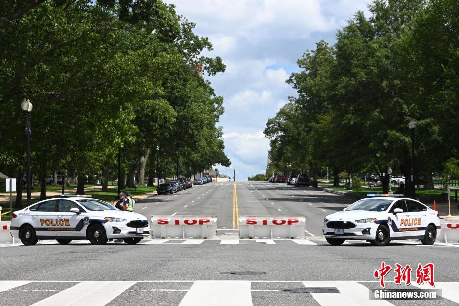 当地时间8月19日,一名男子驾驶黑色皮卡至国会图书馆前,并声称车上有炸弹。该事件导致美国国会大厦周边街道封锁,警方还疏散了周边国会办公楼和联邦最高法院里的工作人员。图为美国会大厦北侧的宪法大道被封锁。 中新社记者 陈孟统 摄