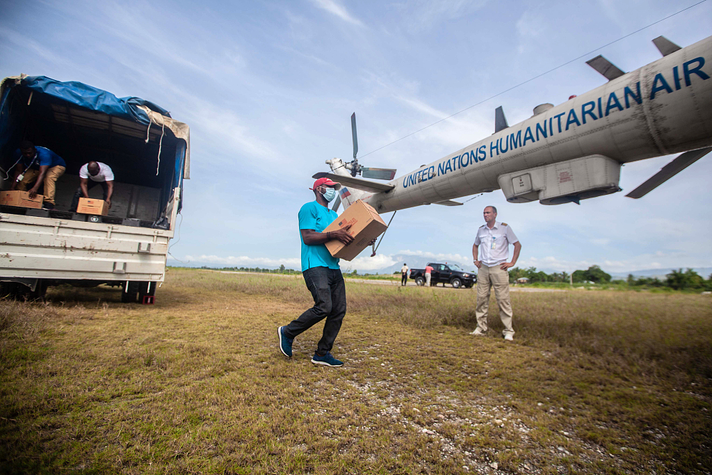 当地时间2021年8月19日,海地莱凯。搜救工作持续中,与此同时,救援物资陆续抵达海地。海地8月14日发生7.2级浅源地震,“今日俄罗斯”(RT)援引海地民防部门18日晚更新的数字称,此次地震已造成至少2189人死亡,12268人受伤,超过300人失踪。图片来源:视觉中国