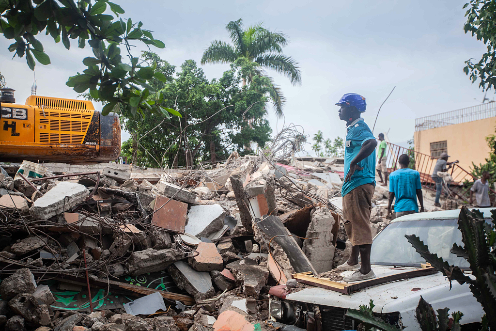 当地时间2021年8月19日,海地莱凯。搜救工作持续中,与此同时,救援物资陆续抵达海地。海地8月14日发生7.2级浅源地震,“今日俄罗斯”(RT)援引海地民防部门18日晚更新的数字称,此次地震已造成至少2189人死亡,12268人受伤,超过300人失踪。图片来源:视觉中国