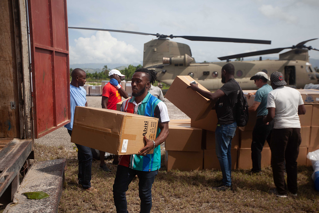 当地时间2021年8月19日,海地莱凯。搜救工作持续中,与此同时,救援物资陆续抵达海地。海地8月14日发生7.2级浅源地震,“今日俄罗斯”(RT)援引海地民防部门18日晚更新的数字称,此次地震已造成至少2189人死亡,12268人受伤,超过300人失踪。图片来源:视觉中国