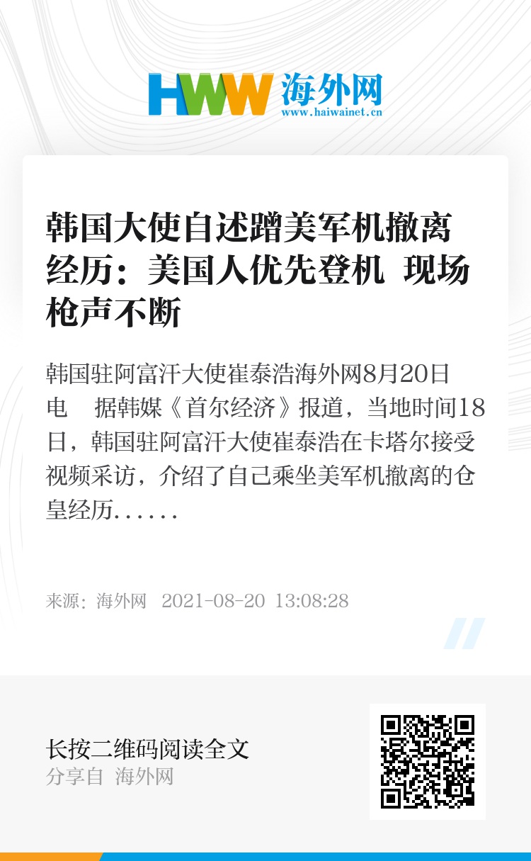 海外网8月20日电 据韩媒《首尔经济》报道,当地时间18日,韩国驻阿富汗大使崔泰浩在卡塔尔接受视频采访,介绍了自己乘坐美军机撤离的仓皇经历。