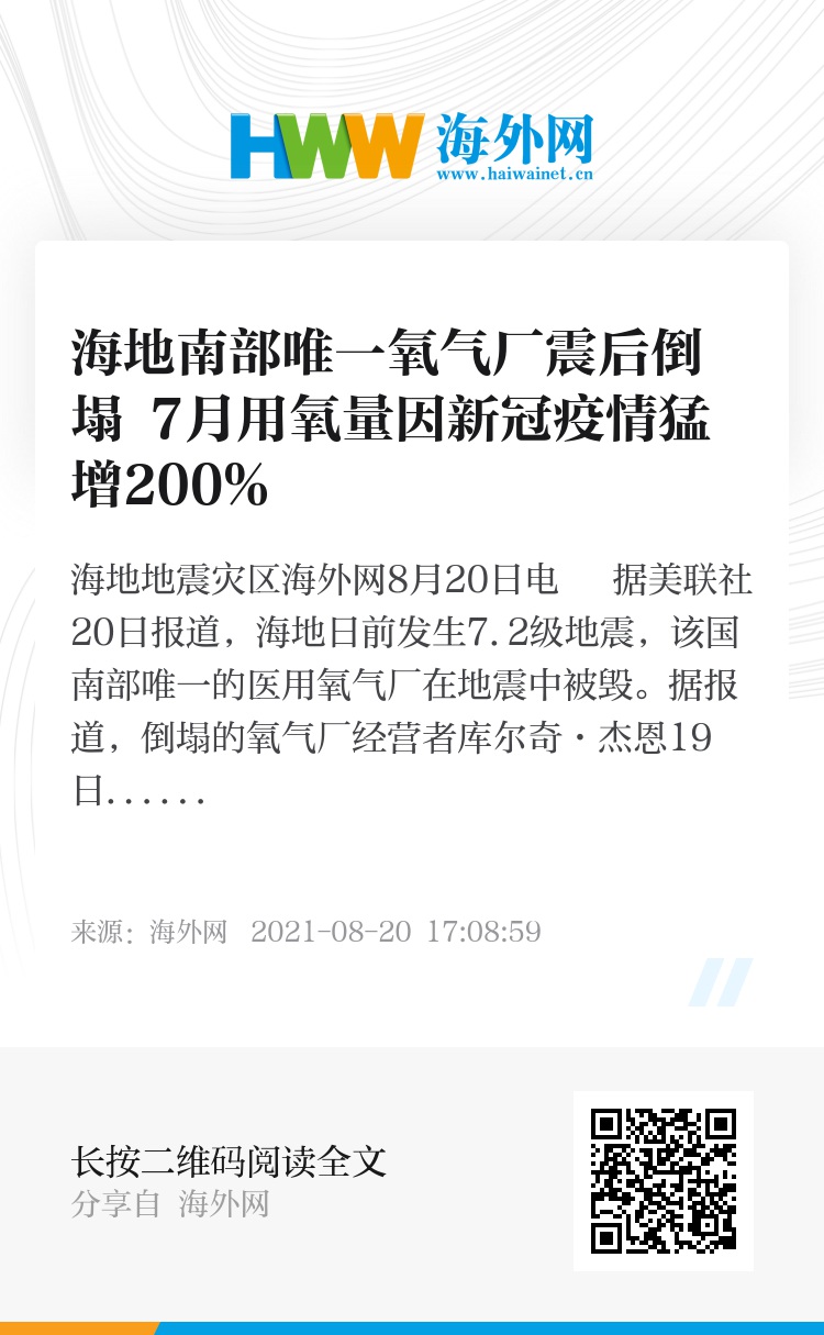 据报道,倒塌的氧气厂经营者库尔奇·杰恩19日表示,制氧机所在的建筑在地震中损毁,制氧机也倒塌。当地医院使用的氧气主要来自该厂和海地太子港的2家医用制氧厂。杰恩说,新冠疫情正在海地加速蔓延,7月医院的用氧量较上月增加了200%。