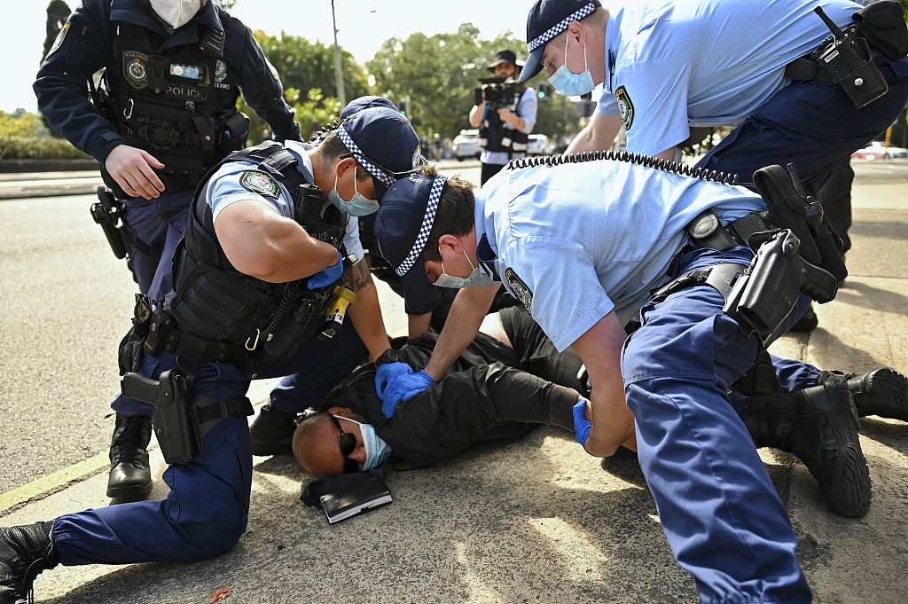 当地时间2021年8月21日,澳大利亚悉尼的大批市民组织在悉尼市中心进行抗议游行,反对新南威尔士州政府实施的“封城”措施。许多参加抗议的民众与警方发生了肢体冲突,多人遭到警方逮捕。图片来源:人民视觉