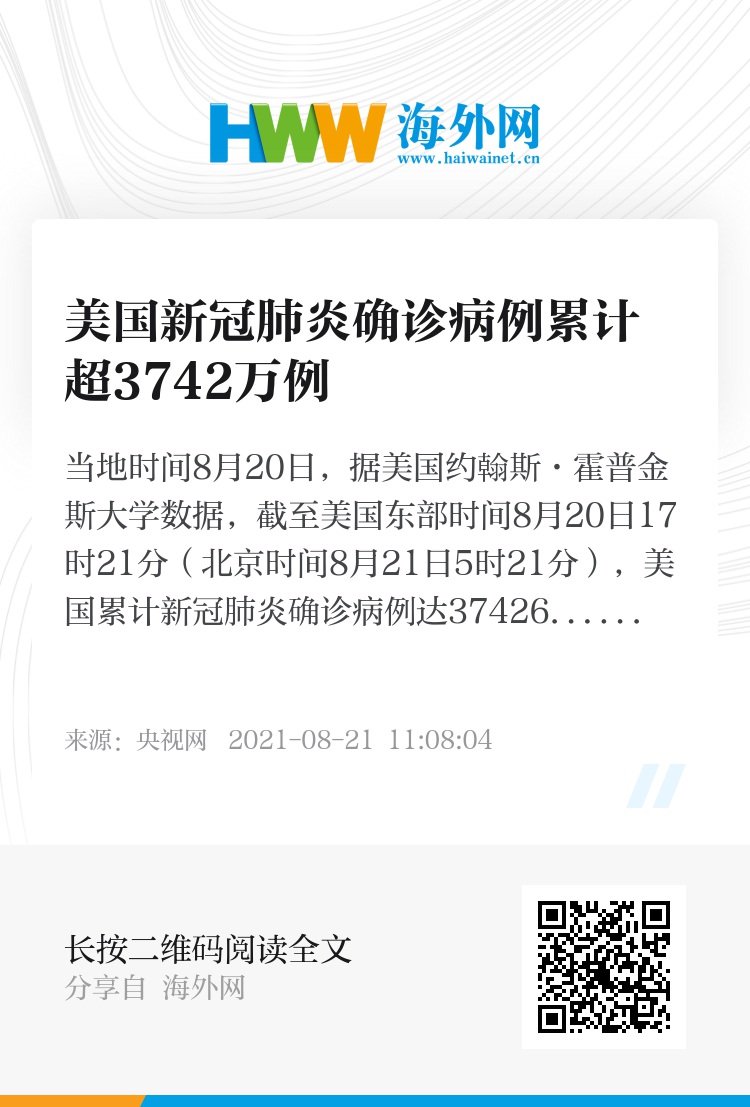 当地时间8月20日,据美国约翰斯·霍普金斯大学数据,截至美国东部时间8月20日17时21分(北京时间8月21日5时21分),美国累计新冠肺炎确诊病例达37426156例 ,累计死亡626225例。与24小时前相比,新增确诊病例163675例,新增死亡病例1350例。(央视记者 刘旭)