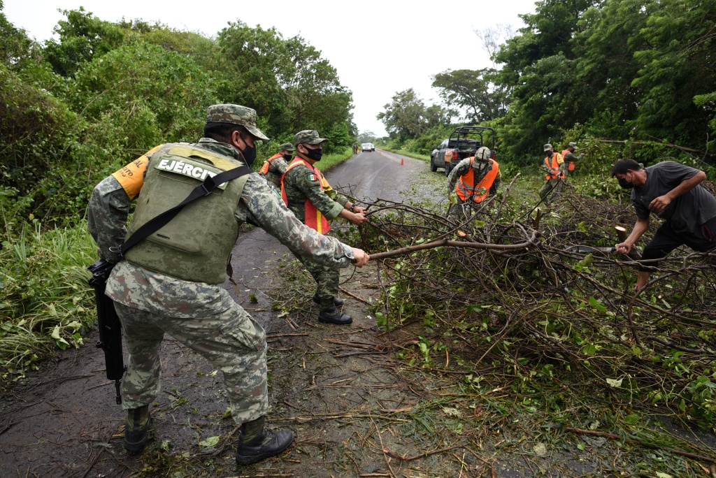 当地时间8月21日,墨西哥特科卢特拉,当地遭飓风“格蕾丝”袭击,军人移除倒塌的树木。图片来源:东方IC