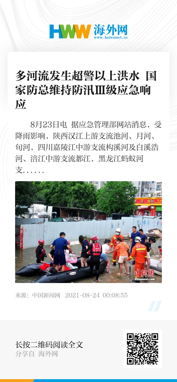 8月23日,国家防总维持防汛Ⅲ级应急响应,仍有3个工作组在黑龙江、山东、陕西三省协助指导防汛救灾工作。