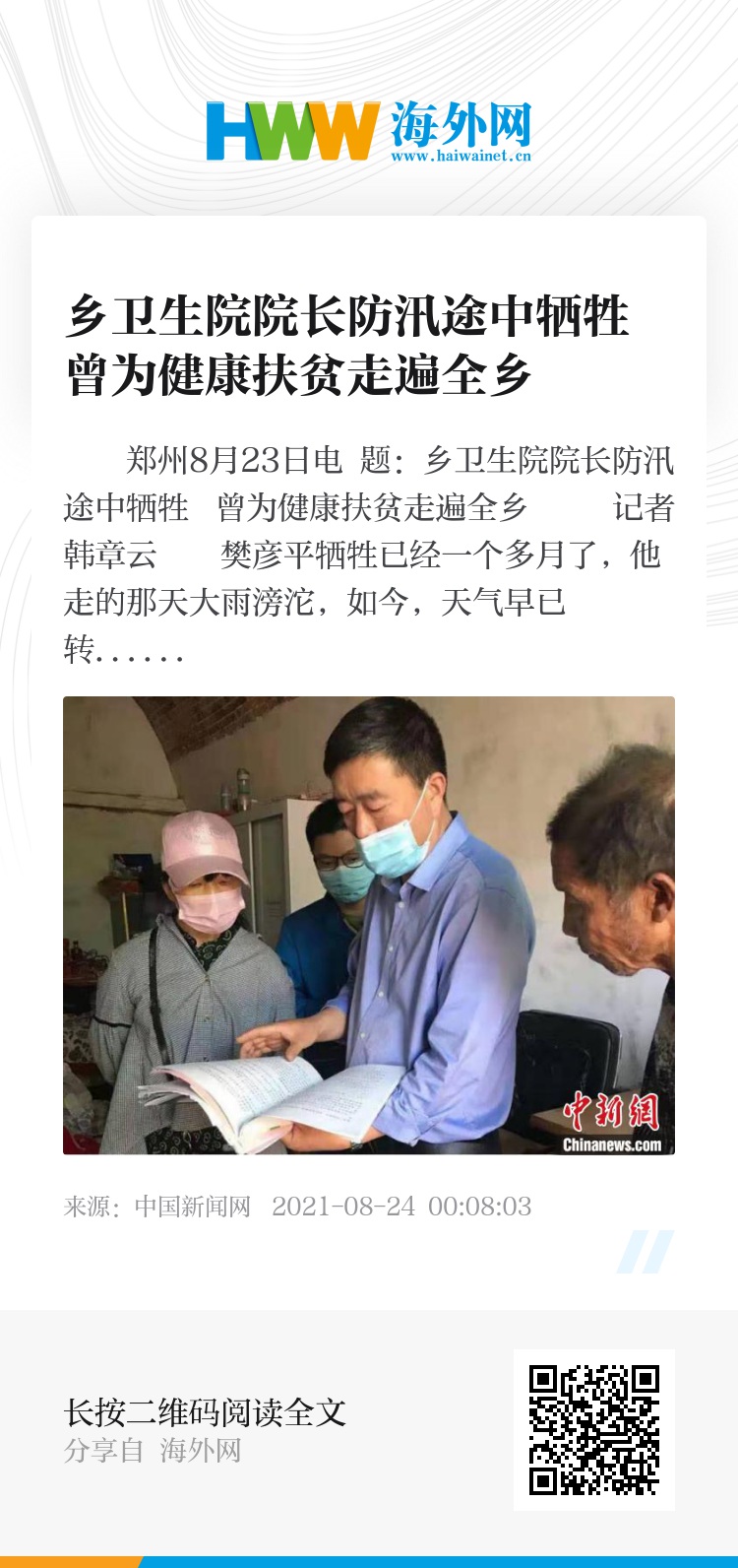 中新网郑州8月23日电 题:乡卫生院院长防汛途中牺牲 曾为健康扶贫走遍全乡