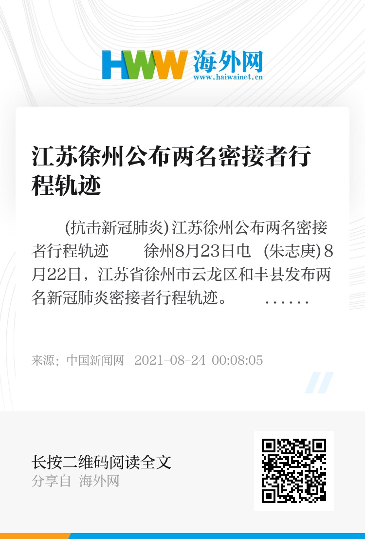 中新网徐州8月23日电 (朱志庚)8月22日,江苏省徐州市云龙区和丰县发布两名新冠肺炎密接者行程轨迹。