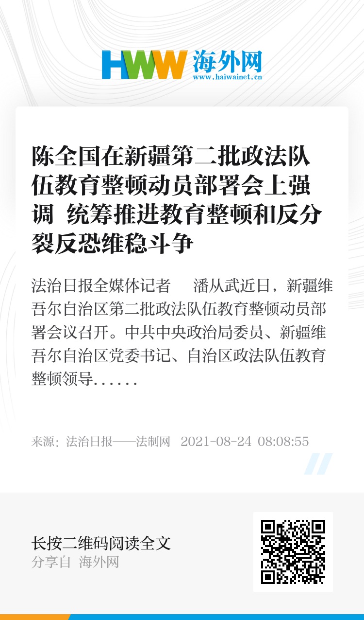 近日,新疆维吾尔自治区第二批政法队伍教育整顿动员部署会议召开。中共中央政治局委员、新疆维吾尔自治区党委书记、自治区政法队伍教育整顿领导小组组长陈全国出席会议并讲话。