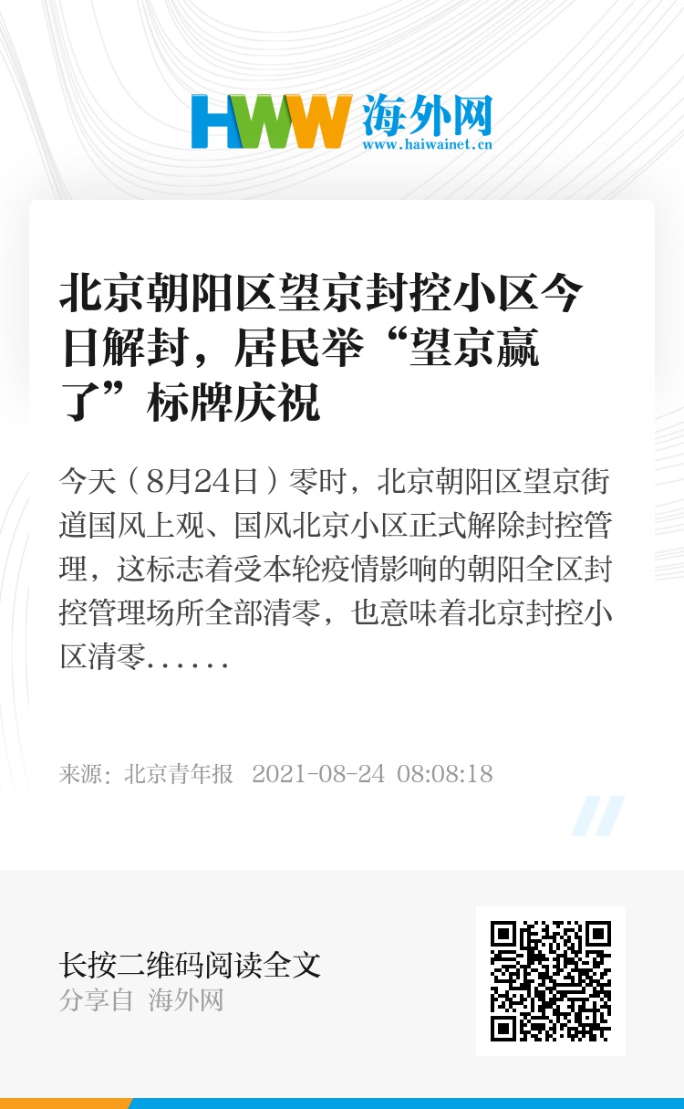 国风上观、国风北京小区8月23日迎来了第6次核酸检测,结果均为阴性,社区环境采集样本为阴性。根据国家和北京市有关规定,经疾控部门研判,望京街道国风上观、国风北京小区于8月24日零点解除封闭管控。